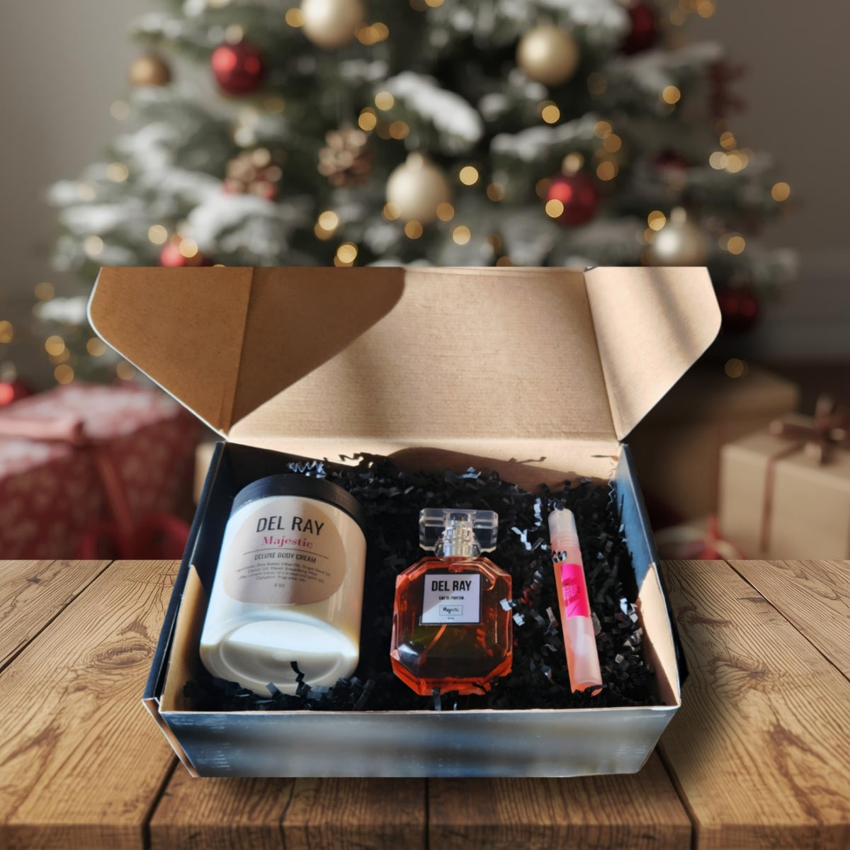 The Del Ray Gift Set is the ultimate choice. This luxurious collection includes a 50ml bottle of your signature scent, a matching 10ml travel spray for fragrance on the go, and an 8 oz. ultra-moisturizing deluxe body cream in the same captivating aroma—ideal for effortless fragrance layering.